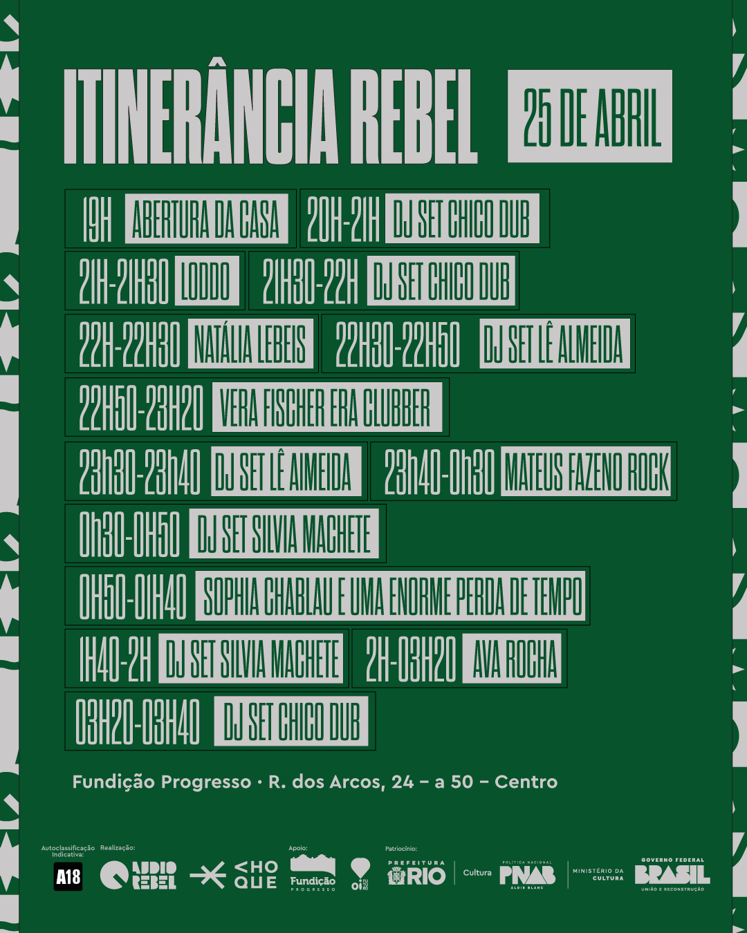 O festival Itinerância Rebel tem como principais objetivos fortalecer a cena carioca de música independente, promovendo redes de trabalho e parcerias, além de contribuir para a quebra das fronteiras simbólicas que ainda limitam o mapa cultural da cidade, muitas vezes restrito ao centro e à zona sul. O projeto gráfico foi concebido a partir de elementos simbólicos inspirados no meu universo autoral, em diálogo com produções visuais anteriores.
